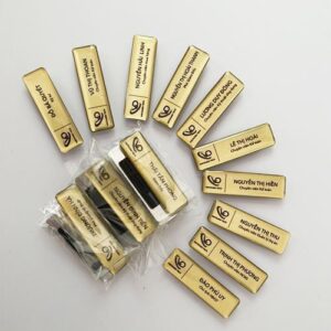 Thẻ tên nam châm : in mầu trên thanh nhôm, đổ keo thủy tinh, dán băng dính 3M trên nam châm viên 3 hạt, cài hoặc tháo dễ dàng, bảo vệ bề mặt vải trang phục, hút chặt cả với chất vải dầy .